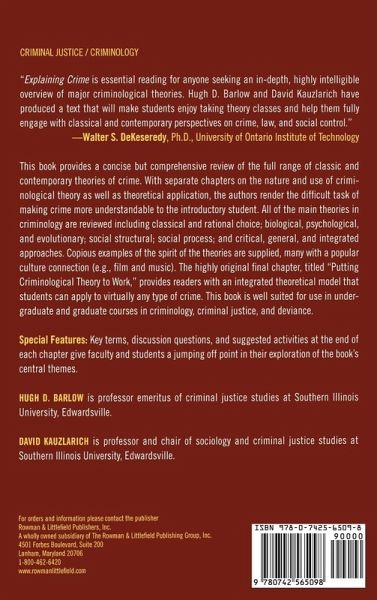 Explaining Crime is essential reading for anyone seeking an in-depth, highly intelligible overview of major criminological theories. Hugh Barlow and David Kauzlarich have produced a text that will make students enjoy taking theory classes and help them fully engage with classical and contemporary perspectives on crime, law, and social control. -- Walter S. DeKeseredy, University of Ontario Institute of Technology