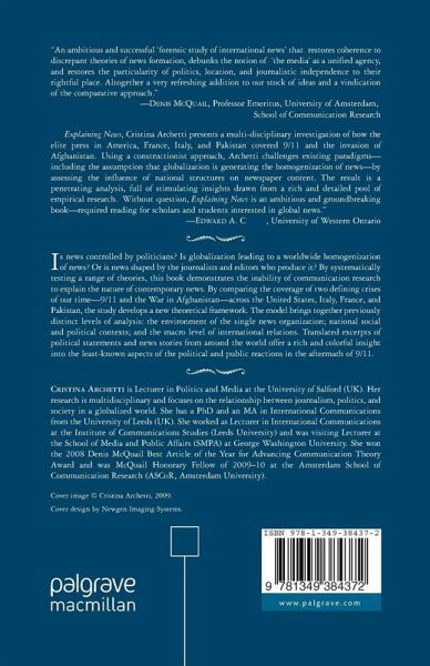 "In Explaining News, Cristina Archetti presents a multi-disciplinary investigation of how the elite press in America, France, Italy, and Pakistan covered 9/11 and the invasion of Afghanistan.Using a constructionist approach, Archetti challenges existing paradigms - including the assumption that globalization is generating the homogenization of news - by assessing the influence of national structures on newspaper content.The result is a penetrating analysis, full of stimulating insights drawn from a rich and detailed pool of empirical research.Without question, Explaining News is an ambitious and groundbreaking book - required reading for scholars and students interested in global news." - Edward A. Comor, University of Western Ontario