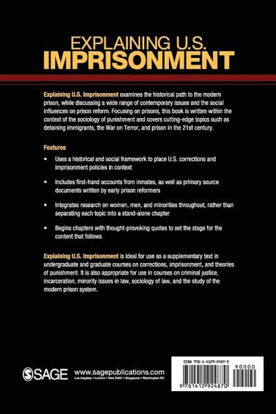 Explaining U.S. Imprisonment examines women in prison, minorities, the historical path to the modern prison, a wide range of contemporary issues, and social influences on prison reform. While focusing on prisons, this one-of-a-kind book is written within the context of the sociology of punishment and covers cutting-edge topics such as detaining immigrants, the War on Terror, and prison in the 21st century. FeaturesUses a historical and social framework to place U.S. corrections and imprisonment policies in context Includes first-hand accounts from inmates, as well as primary source documents written by early prison reformers Integrates research on women, men, and minorities throughout, rather than separating each topic into a stand-alone chapter Begins chapters with thought-provoking quotes to set the stage for the content that follows Explaining U.S. Imprisonment is ideal for use as a supplementary text in undergraduate and graduate courses on corrections, imprisonment, and theories of punishment. It is also appropriate for use in courses on criminal justice, incarceration, minority issues in law, sociology of law, and the study of the modern prison system.