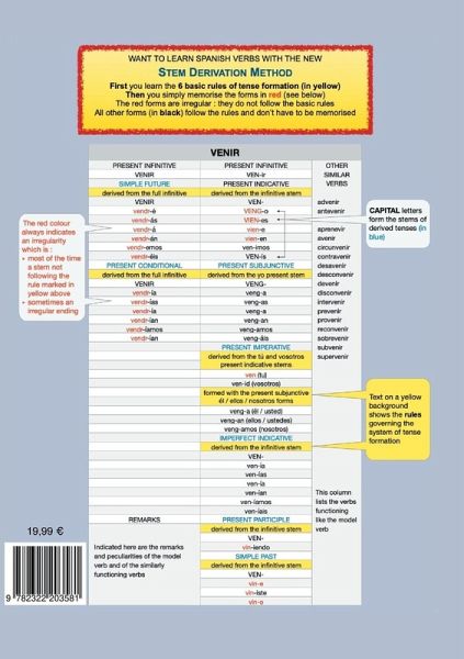WANT TO LEARN SPANISH VERBS THE EASY WAY ?Memorize selectively and not mechanically !This book aims at teaching the Spanish verb conjugation through a new method called the STEM DERIVATION METHOD.It is a modern working tool : the method is self-teaching and you can learn alone, saving yourself a huge amount of time and effort.There are 6 basic tense formation rules (in yellow) to know.Any form in red is irregular and does not follow the appropriate rule.So, you simply memorize the forms in red in the verb charts.You will gain confidence as the language will appear logical.