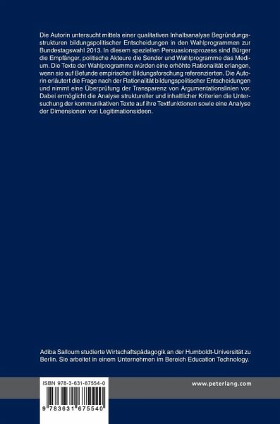 Die Autorin untersucht mittels einer qualitativen Inhaltsanalyse Begründungsstrukturen bildungspolitischer Entscheidungen in den Wahlprogrammen zur Bundestagswahl 2013. In diesem speziellen Persuasionsprozess sind Bürger die Empfänger, politische Akteure die Sender und Wahlprogramme das Medium. Die Texte der Wahlprogramme würden eine erhöhte Rationalität erlangen, wenn sie auf Befunde empirischer Bildungsforschung referenzierten. Die Autorin erläutert die Frage nach der Rationalität bildungspolitischer Entscheidungen und nimmt eine Überprüfung der Transparenz von Argumentationslinien vor. Dabei ermöglicht die Analyse struktureller und inhaltlicher Kriterien die Untersuchung der kommunikativen Texte auf ihre Textfunktionen sowie eine Analyse der Dimensionen von Legitimationsideen.