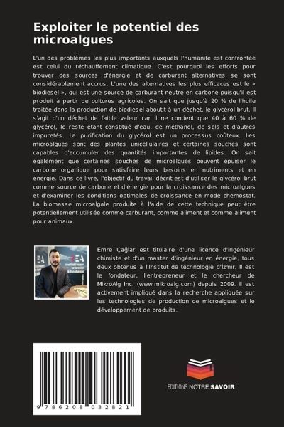 L'un des problèmes les plus importants auxquels l'humanité est confrontée est celui du réchauffement climatique. C'est pourquoi les efforts pour trouver des sources d'énergie et de carburant alternatives se sont considérablement accrus. L'une des alternatives les plus efficaces est le « biodiesel », qui est une source de carburant neutre en carbone puisqu'il est produit à partir de cultures agricoles. On sait que jusqu'à 20 % de l'huile traitée dans la production de biodiesel aboutit à un déchet, le glycérol brut. Il s'agit d'un déchet de faible valeur car il ne contient que 40 à 60 % de glycérol, le reste étant constitué d'eau, de méthanol, de sels et d'autres impuretés. La purification du glycérol est un processus coûteux. Les microalgues sont des plantes unicellulaires et certaines souches sont capables d'accumuler des quantités importantes de lipides. On sait également que certaines souches de microalgues peuvent épuiser le carbone organique pour satisfaire leurs besoins en nutriments et en énergie. Dans ce livre, l'objectif du travail décrit est d'utiliser le glycérol brut comme source de carbone et d'énergie pour la croissance des microalgues et d'examiner les conditions optimales de croissance en mode chemostat. La biomasse microalgale produite à l'aide de cette technique peut être potentiellement utilisée comme carburant, comme aliment et comme aliment pour animaux.