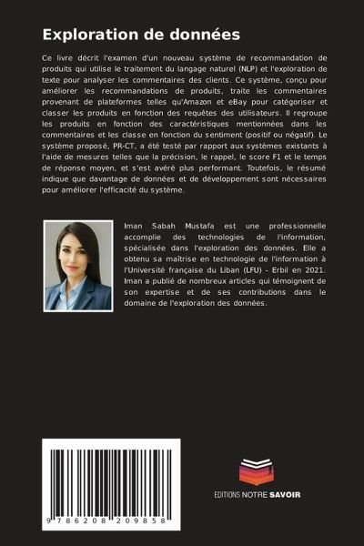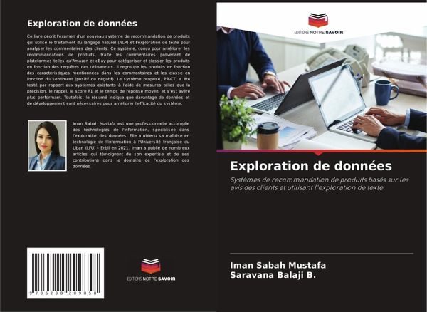Ce livre décrit l'examen d'un nouveau système de recommandation de produits qui utilise le traitement du langage naturel (NLP) et l'exploration de texte pour analyser les commentaires des clients. Ce système, conçu pour améliorer les recommandations de produits, traite les commentaires provenant de plateformes telles qu'Amazon et eBay pour catégoriser et classer les produits en fonction des requêtes des utilisateurs. Il regroupe les produits en fonction des caractéristiques mentionnées dans les commentaires et les classe en fonction du sentiment (positif ou négatif). Le système proposé, PR-CT, a été testé par rapport aux systèmes existants à l'aide de mesures telles que la précision, le rappel, le score F1 et le temps de réponse moyen, et s'est avéré plus performant. Toutefois, le résumé indique que davantage de données et de développement sont nécessaires pour améliorer l'efficacité du système.