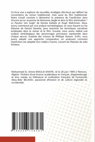 Ce livre vise à explorer de nouvelles stratégies d'écriture qui défient les conventions du roman traditionnel, mais aussi du film traditionnel. Notre travail consiste à démontrer la présence de l'exofiction dans Vincent qu'on assassine de Marianne Jaeglé et dans le film d'animation " La Passion Van Gogh" de Dorota Kobiela et Hugh Welchman. Nous avons commencé par une analyse narratologique, en nous basant sur les théories de Gérard Genette, pour examiner les techniques narratives employées dans le roman et le film. Ensuite, nous avons réalisé une analyse sémiologique des personnages principaux représentés dans chaque oeuvre, inspirée des travaux de Philippe Hamon. Enfin, nous avons adopté une approche comparative, en analysant comment l'exofiction est adaptée d'un média à l'autre, suivant les théories de Julia Kristeva.