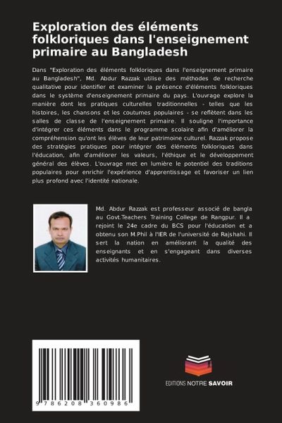 Dans "Exploration des éléments folkloriques dans l'enseignement primaire au Bangladesh", Md. Abdur Razzak utilise des méthodes de recherche qualitative pour identifier et examiner la présence d'éléments folkloriques dans le système d'enseignement primaire du pays. L'ouvrage explore la manière dont les pratiques culturelles traditionnelles - telles que les histoires, les chansons et les coutumes populaires - se reflètent dans les salles de classe de l'enseignement primaire. Il souligne l'importance d'intégrer ces éléments dans le programme scolaire afin d'améliorer la compréhension qu'ont les élèves de leur patrimoine culturel. Razzak propose des stratégies pratiques pour intégrer des éléments folkloriques dans l'éducation, afin d'améliorer les valeurs, l'éthique et le développement général des élèves. L'ouvrage met en lumière le potentiel des traditions populaires pour enrichir l'expérience d'apprentissage et favoriser un lien plus profond avec l'identité nationale.