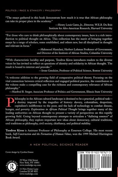 1. Introduction: African Philospohy for the New Millenium Teodros Kiros 2. The Proverb and Oral Society 3. Society and Democracy in Africa 3. Ibn Khaldun: A Dialectical Philosopher for the Twenty-First Century George Katsiaficas 4. Critical Rationalism and Cultural Traditions Dismas Masolo 5. Normative Instability as the Cause of African Political Disorder I.F. Menkiti 6. The Wisdon of African Sages Gail M. Presbey 6. Ideology and Political Culture in Africa Ali Mazrui 7. Civil Society Matters Ajume Wingeo 8. Chieftancy as an NGO Anthony Appiah9. Democracy in Africa Immanuel Eze