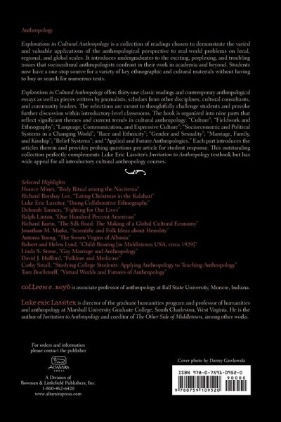 Explorations in Cultural Anthropology is a collection of readings chosen to demonstrate the varied and valuable applications of the anthropological perspective to real-world problems on local, regional, and global scales. It introduces undergraduates to the exciting, perplexing, and troubling issues that socio-cultural anthropologists confront in their work in academia and beyond. Students now have a one-stop source for a variety of key ethnographic and cultural materials without having to buy or search for numerous texts. Explorations in Cultural Anthropology offers 31 classic readings and contemporary anthropological essays as well as pieces written by journalists, scholars from other disciplines, cultural consultants, and community leaders. The selections are meant to thoughtfully challenge students and provoke further discussion within introductory-level classrooms. The book is organized into nine parts that reflect significant themes and current trends in cultural anthropology: Culture; Fieldwork and Ethnography; Language, Communication, and Expressive Culture; Socio-economic and Political Systems in a Changing World; Race and Ethnicity; Gender and Sexuality; Marriage, Family, and Kinship; Belief Systems; and Applied and Future Anthropologies. Each part introduces the articles therein and provides probing questions per article for student response. This outstanding collection perfectly complements Luke Eric Lassiter's Invitation to Cultural Anthropology textbook but has wide appeal for all introductory cultural anthropology courses.