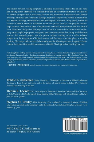 The tension between reading Scripture as primarily a historically situated text on one hand and binding canon addressed to a community of faith on the other constitutes a crucial issue for biblical interpretation. Considering the ways the disciplines of Biblical Studies, Biblical Theology, Patristics, and Systematic Theology approach Scripture and biblical interpretation, the "Biblical Theology, Hermeneutics, and Theological Disciplines" study group, within the Institute of Biblical Research, established a four-year project aimed at clarifying the relationships between these diverse lines of inquiry into scriptural interpretation found in each of these disciplines. The goal of this project was to foster a sustained discussion where exploratory papers might be proposed, composed, and rewritten for final form using a collaborative process. This research project, and the present volume resulting from it, offers valuable insights into the integration of Biblical Studies and Theology as subdisciplines within the academy. The essays collected here fall naturally into the following sections: Exegetical Explorations, Reception-Historical Explorations, and finally Theological-Practical Explorations.