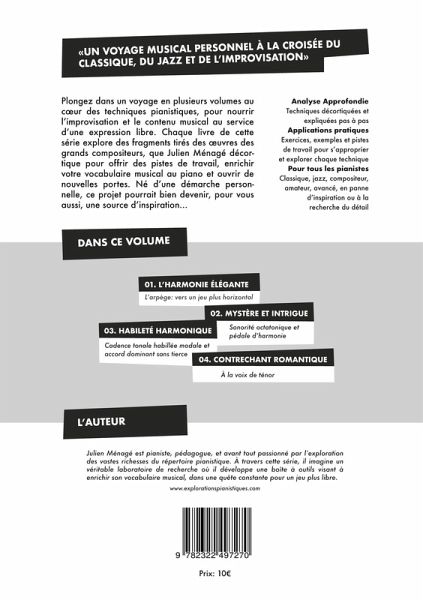 Plongez dans un voyage en plusieurs volumes au coeur des techniques pianistiques, pour nourrir l'improvisation et le contenu musical au service d'une expression plus libre en piano solo. Chaque livre de cette série explore des fragments tirés des oeuvres des grands compositeurs, que Julien Ménagé décortique pour offrir des pistes de travail, enrichir votre vocabulaire pianistique et ouvrir de nouvelles portes. Né d'une démarche personnelle, ce projet pourrait bien devenir, pour vous aussi, une source d'inspiration...