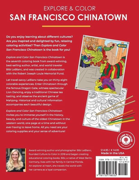 Do you enjoy learning about different cultures? Are you inspired and delighted by fun, relaxing coloring activities? Then Explore the Sights of San Francisco Chinatown is the book for you! Explore the Sights of San Francisco Chinatown is the seventh coloring book from award-winning, best-selling author, artist, and world traveler Bibi LeBlanc, and was created in collaboration with the Robert Joseph Louie Memorial Fund. Let travel-savvy LeBlanc take you on thirty-eight colorable experiences. Enter Chinatown through the famous Dragon Gate, witness spectacular Lion Dancing, enjoy a traditional Chinese tea tasting, and observe the ancient game of Mahjong. Historical and cultural information accompanies each beautiful design. Explore the Sights of San Francisco Chinatown invites you to immerse yourself in the history, beauty, and culture of the oldest and largest Chinatown in the western world, one page at a time and without ever having to leave home. All you need are your coloring supplies and your sense of adventure! This book was designed to inspire, inform, and encourage your family to explore and seek out adventure, culture, and history together! Award-winning author and photographer Bibi LeBlanc, founded Culture to Color in 2018 and began creating educational coloring books. Bibi, a native of West Berlin, Germany, lives with her family in Central Florida. An explorer at heart, she travels the world with a camera as her loyal companion. "I get to combine the three things I love most: Traveling, taking photos and meeting people and hearing their stories I have created this book to inspire, inform, and encourage families to explore and seek out adventure, culture, and history together."