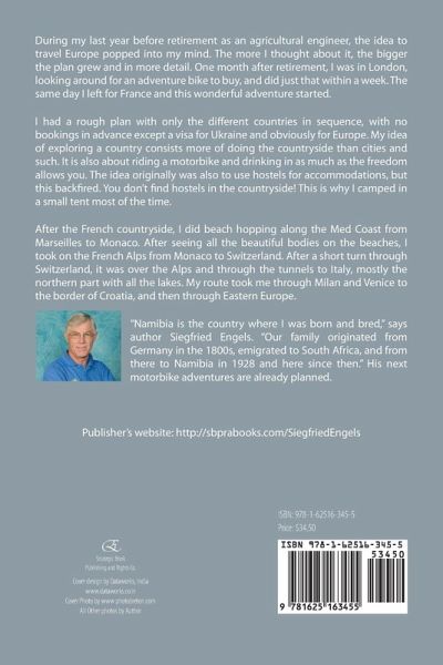 During my last year before retirement as an agricultural engineer, the idea to travel Europe popped into my mind. The more I thought about it, the bigger the plan grew and in more detail. One month after retirement, I was in London, looking around for an adventure bike to buy, and did just that within a week. The same day I left for France and this wonderful adventure started. I had a rough plan with only the different countries in sequence, with no bookings in advance except a visa for Ukraine and obviously for Europe. My idea of exploring a country consists more of doing the countryside than cities and such. It is also about riding a motorbike and drinking in as much as the freedom allows you. The idea originally was also to use hostels for accommodations, but this backfired. You don't find hostels in the countryside! This is why I camped in a small tent most of the time. After the French countryside, I did beach hopping along the Med Coast from Marseilles to Monaco. After seeing all the beautiful bodies on the beaches, I took on the French Alps from Monaco to Switzerland. After a short turn through Switzerland, it was over the Alps and through the tunnels to Italy, mostly the northern part with all the lakes. My route took me through Milan and Venice to the border of Croatia, and then through Eastern Europe. "Namibia is the country where I was born and bred," says author Siegfried Engels. "Our family originated from Germany in the 1800s, emigrated to South Africa, and from there to Namibia in 1928 and here since then." His next motorbike adventures are already planned. Publisher's website: http://sbprabooks.com/SiegfriedEngels