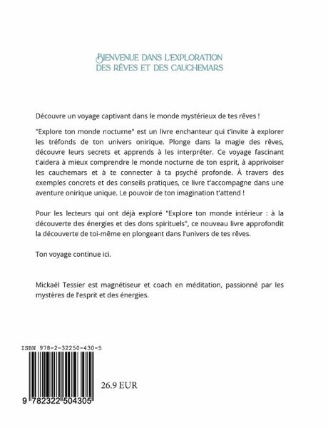 Bienvenue dans l'univers envoûtant de "Explore ton monde nocturne". Ce livre est une invitation à plonger dans les profondeurs mystérieuses de la nuit. Découvrez les secrets des rêves, apprenez à les interpréter, et explorez le royaume fascinant de votre propre esprit. Entre aventures oniriques et expériences énigmatiques, ce voyage vous aidera à mieux comprendre le monde nocturne de vos rêves, à apprivoiser les cauchemars et à vous connecter à la merveilleuse diversité de votre monde intérieur. "À la découverte des rêves et des cauchemars" est un guide captivant pour tous les âges, une passerelle vers une meilleure compréhension de vous-même et de votre monde onirique.