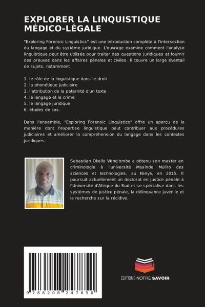 "Exploring Forensic Linguistics" est une introduction complète à l'intersection du langage et du système juridique. L'ouvrage examine comment l'analyse linguistique peut être utilisée pour traiter des questions juridiques et fournir des preuves dans les affaires pénales et civiles. Il couvre un large éventail de sujets, notamment1. le rôle de la linguistique dans le droit2. la phonétique judiciaire3. l'attribution de la paternité d'un texte4. le langage et le crime5. le langage juridique6. études de cas.Dans l'ensemble, "Exploring Forensic Linguistics" offre un aperçu de la manière dont l'expertise linguistique peut contribuer aux procédures judiciaires et améliorer la compréhension du langage dans les contextes juridiques.
