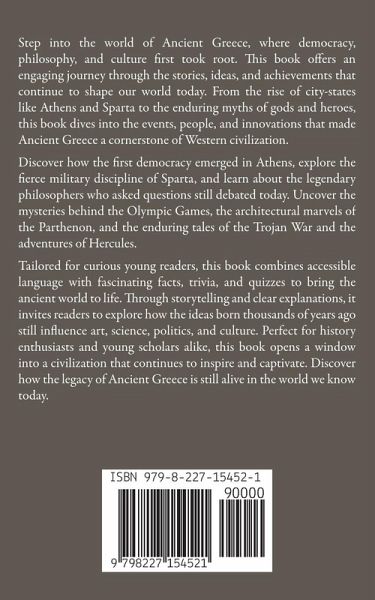 Step into the world of Ancient Greece, where democracy, philosophy, and culture first took root. This book offers an engaging journey through the stories, ideas, and achievements that continue to shape our world today. From the rise of city-states like Athens and Sparta to the enduring myths of gods and heroes, this book dives into the events, people, and innovations that made Ancient Greece a cornerstone of Western civilization. Discover how the first democracy emerged in Athens, explore the fierce military discipline of Sparta, and learn about the legendary philosophers who asked questions still debated today. Uncover the mysteries behind the Olympic Games, the architectural marvels of the Parthenon, and the enduring tales of the Trojan War and the adventures of Hercules. Tailored for curious young readers, this book combines accessible language with fascinating facts, trivia, and quizzes to bring the ancient world to life. Through storytelling and clear explanations, it invites readers to explore how the ideas born thousands of years ago still influence art, science, politics, and culture. Perfect for history enthusiasts and young scholars alike, this book opens a window into a civilization that continues to inspire and captivate. Discover how the legacy of Ancient Greece is still alive in the world we know today.