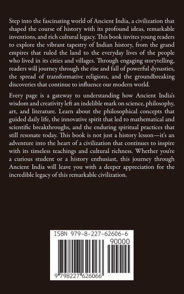 Step into the fascinating world of Ancient India, a civilization that shaped the course of history with its profound ideas, remarkable inventions, and rich cultural legacy. This book invites young readers to explore the vibrant tapestry of Indian history, from the grand empires that ruled the land to the everyday lives of the people who lived in its cities and villages. Through engaging storytelling, readers will journey through the rise and fall of powerful dynasties, the spread of transformative religions, and the groundbreaking discoveries that continue to influence our modern world. Every page is a gateway to understanding how Ancient India's wisdom and creativity left an indelible mark on science, philosophy, art, and literature. Learn about the philosophical concepts that guided daily life, the innovative spirit that led to mathematical and scientific breakthroughs, and the enduring spiritual practices that still resonate today. This book is not just a history lesson-it's an adventure into the heart of a civilization that continues to inspire with its timeless teachings and cultural richness. Whether you're a curious student or a history enthusiast, this journey through Ancient India will leave you with a deeper appreciation for the incredible legacy of this remarkable civilization.