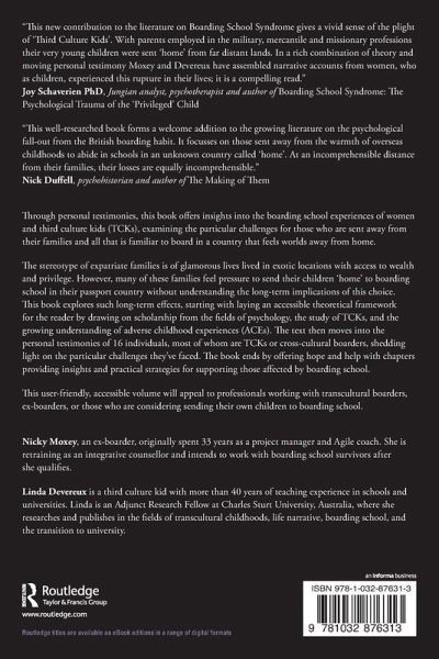 Nicky Moxey, an ex-boarder, originally spent 33 years as a project manager and Agile coach. She is retraining as an integrative counsellor and intends to work with boarding school survivors after she qualifies. Linda Devereux is a third culture kid with more than 40 years of teaching experience in schools and universities. Linda is an Adjunct Research Fellow at Charles Sturt University, Australia, where she researches and publishes in the fields of transcultural childhoods, life narrative, boarding school, and the transition to university.