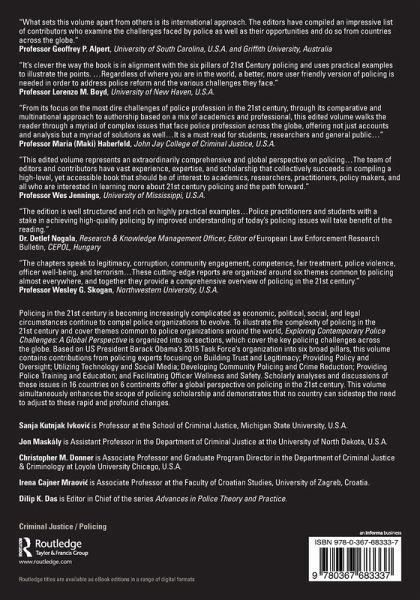 "This edited volume represents an extraordinarily comprehensive and global perspective on policing. Organized masterfully around the pressing issues for policing in the 21st century (i.e., trust and legitimacy, policy and oversight, technology and social media, community policing and crime reduction, training and education, and officer wellness and safety), this book takes the reader on a deep dive into these challenges and areas for growth and advancement in policing. The team of editors and contributors have vast experience, expertise, and scholarship that collectively succeeds in compiling a high-level, yet accessible book that should be of interest to academics, researchers, practitioners, policy makers, and all who are interested in learning more about 21st century policing and the path forward."