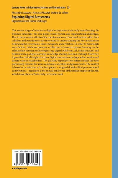 The recent surge of interest in digital ecosystems is not only transforming the business landscape, but also poses several human and organizational challenges. Due to the pervasive effects of the transformation on firms and societies alike, both scholars and practitioners are interested in understanding the key mechanisms behind digital ecosystems, their emergence and evolution. In order to disentangle such factors, this book presents a collection of research papers focusing on the relationship between technologies (e.g. digital platforms, AI, infrastructure) and behaviours (e.g. digital learning, knowledge sharing, decision-making). Moreover, it provides critical insights into how digital ecosystems can shape value creation and benefit various stakeholders. The plurality of perspectives offered makes the book particularly relevant for users, companies, scientists and governments. The content is based on a selection of the best papers - original double-blind peer-reviewed contributions - presented at the annual conference of the Italian chapter of the AIS, which took place in Pavia, Italy in October 2018.