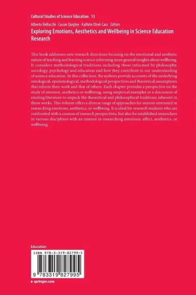 Emotions, aesthetics and wellbeing in science education: theoretical foundations, Alberto Bellocchi, Cassie F. Quigley and Kathrin Otrel-Cass.- PART I AESTHETICS IN SCIENCE EDUCATION.- Back to the drawing board- examining the philosophical foundations of educational research on emotions and aesthetics, Per-Olof Wickman.- Taste for science: a Bourdieuan-pragmatism approach to interest, aesthetics and learning, Per Anderhag.- The heart of the educator: aesthetic experience shaping knowledge, identity and passion, Linda Hobbs and Leissa Kelly.- PART II EMOTION AND AFFECT IN SCIENCE EDUCATION.- Interaction ritual approaches to emotion and cognition in science learning experiences, Alberto Bellocchi.- Emotional events in learning science, Stephen M. Ritchie and Jen Beers Newlands.- Emotions, social beings & ethnomethods: understanding analogical reasoning in everyday science classrooms, James P. Davis.- Our neighborhood: a place for heightening emotional energy in science education, Kristin Cook and Gayle Buck.- Emotions- connecting with the missing body. Liv Kondrup Kristensen and Kathrin Otrel-Cass.- Interest and emotions in science education, Morten Rask Petersen and Niels Bonderup Dohn.- Science and the arts: curriculum integration, learning and emotions in schools, Tatiana Chemi.- PART III WELLNESS AND WELLBEING IN SCIENCE EDUCATION.- Jin Shin Jyutsu and ameliorating emotion, enhancing mindfulness, and sustaining productive learning environments, Ken Tobin, Konstantinos Alexakos, Anna Malyukova, and Al-Karim H. Gangji.- The role of care in environmental education, Cassie F. Quigley and Renée Lyons.- Afterword- Science education and the promises of aesthetics, emotion and wellbeing, Steve Alsop.-Index.