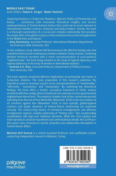 This book explores emotional-affective implications of partnership and rivalry in Turkey-Iran relations. The main proposition of this research underlines the theoretical need to reconnect psycho-social conceptualizations of "emotionality," "affectivity," "normativity," and "relationality." By combining key theoretical findings, the book offers a holistic conceptual framework to better analyze emotional-affective configuration of relational rules and roles in trans-governmental neighborhood interactions. The empirical chapters look at four consecutive periods extending from the end of First World War (November 1918) to the resuscitation of US sanctions against Iran (November 2018). In each episode, global-regional contours and dyadic dynamics of Ankara-Tehran relationship are examined critically. The century-long history of emotional entanglements and affective arrangements exposes complex patterning of "feeling rules." Two countervailing constellations still reign over relationalnarratives. While the 1514 Çaldiran war myth reproduces sectarian resentment and confrontational climate, the 1639 Kasr-i Sirin peace story reconstructs secular sympathy and collaborative atmosphere in Turkish-Iranian affairs.