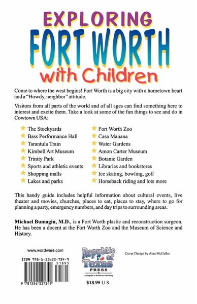 Come to where the west begins! Fort Worth is a big city with a hometown heart and a YHowdy, neighbor? attitude. Visitors from all parts of the world and of all ages can find something here to interest and excite them. Take a look at some of the fun things to see and do in Cowtown USA: The StockyardsFort Worth ZooBass Performance HallCasa MananaTarantula TrainWater GardensKimbell Art MuseumAmon Carter MuseumTrinity ParkBotanic GardenSports and athletic eventsLibraries and bookstoresShopping mallsIce skating, bowling, golfLakes and parksHorseback riding and lots moreThis handy guide includes helpful information about cultural events, live theater and movies, churches, places to eat, places to stay, where to go for planning a party, emergency numbers, and day trips to surrounding areas. Michael Bumagin, M.D., is a Fort Worth plastic and reconstruction surgeon. He has been a docent at the Fort Worth Zoo and the Museum of Science and History.