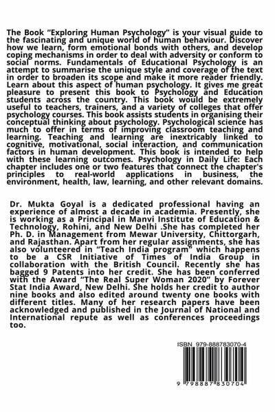 The book "Exploring Human Psychology" has been introduced to provide current information and meet the urgent needs of students pursuing B.Ed, M.Ed, and B.A . An (Education) degree and preparing for NET-JRF, SET, SLET, and other competitive exams. We are confident that this book meets all essential requirements, and its widespread distribution will significantly impact educational theory. In completing this self-imposed stupendous task, the authors were acutely aware of their numerous limitations in light of the diverse subject-matter required to complete this volume. Educational Psychology has been taught as a major subject in Teacher Education Programs at various levels on the implicit assumption that knowledge of Educational Psychology provides insight into problems of teaching learning and develops other necessary professional skills and competencies in progressive teachers to face the classroom teaching give the teacher much of what he needs to achieve his goals by enabling him to understand, control, and predict the behaviour of his students. Psychologists frequently define learning as a relatively permanent change in behaviour as a result of experience. The psychology of learning is concerned with various issues concerning how people learn and interact with their surroundings. The behaviourists believed that psychology should be the scientific study of observable behaviour.