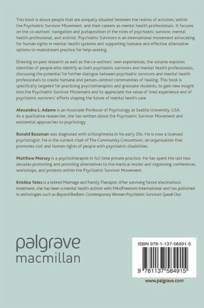 This book is about people that are uniquely situated between the realms of activism, within the Psychiatric Survivor Movement, and their careers as mental health professionals. It focuses on the co-authors' navigation and juxtaposition of the roles of psychiatric survivor, mental health professional, and activist.