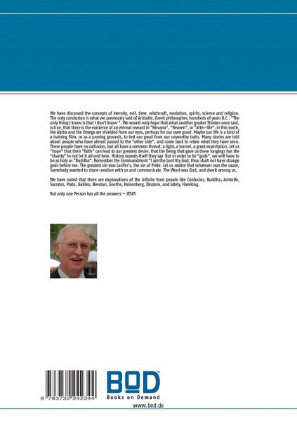 We have discussed the concepts of eternity, evil, time, witchcraft, evolution, spirits, science and religion. The only conclusion is what we previously said of Aristotle, Greek philosopher, hundreds of years B.C.: "The only thing I know is that I don't know ". We would only hope that what another greater Thinker once said, is true, that there is the existence of an eternal reward in "Nirvana", "Heaven", or "after-life". In this earth, the Alpha and the Omega are shielded from our eyes, perhaps for our own good. Maybe our life is a kind of a training film, or as a proving grounds, to test our good from our unworthy traits. Many stories are told about people who have almost passed to the "other side", and come back to relate what they have seen. These people have no collusion, but all have a common thread: a light, a tunnel, a great expectation. Let us "hope" that their "faith" can lead to our greatest desire, that the Being that gave us these longings has the "charity" to not let it all end here. History repeats itself they say. But in order to be "gods", we will have to be as holy as "Buddha". Remember the Commandment "I am the Lord thy God, thou shalt not have strange gods before me. The greatest sin was Lucifer's, the sin of Pride. Let us realize that whatever was the cause, Somebody wanted to share creation with us and communicate. The Word was God, and dwelt among us. We have noted that there are explanations of the infinite from people like Confucius, Buddha, Aristotle, Socrates, Plato, Galileo, Newton, Goethe, Heisenberg, Einstein, and lately, Hawking. But only one Person has all the answers - JESUS