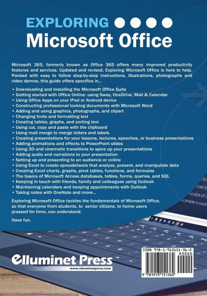 Microsoft 365, formerly known as Office 365 offers many improved productivity features and services. Updated and revised, Exploring Microsoft Office is here to help. Packed with easy to follow step-by-step instructions, illustrations, photographs and video demos, this guide offers specifics in... Downloading and Installing the Microsoft Office Suite Getting started with Office Online: using Sway, OneDrive, Mail & Calendar Using Office Apps on your iPad or Android device Constructing professional looking documents with Microsoft Word Adding and using graphics, photographs, and clipart Changing fonts, creating tables, graphs, clipboard, sorting and formatting text, and mail merge Creating presentations for your lessons, lectures, speeches, or business presentations using PowerPoint. Adding animations and effects to PowerPoint slides Using 3D and cinematic transitions to spice up your presentations Using Excel to create spreadsheets that analyse, present, and manipulate data Creating Excel charts, graphs, pivot tables, functions, and formulas The basics of Microsoft Access databases, tables, forms, queries, and SQL Keeping in touch with friends, family and colleagues using Outlook Maintaining calendars and keeping appointments with Outlook Taking notes with OneNote, and more... Unlike other books and manuals that assume a computing background not possessed by beginners, Exploring Microsoft Office tackles the fundamentals of Microsoft Office, so that everyone from students, to senior citizens, to home users pressed for time, can understand. So, if you're looking for an Office manual, a visual book, simplified tutorial, dummies guide, or reference, Exploring Microsoft Office will help you maximize the potential of Microsoft Office to increase your productivity, and help you take advantage of the digital revolution. We want to create the best possible resource to help you, so if we've missed anything out then please get in touch using office@elluminetpress.com and let us know. Thanks.