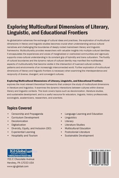 "This book aims to provide a thorough understanding of the most relevant theoretical frameworks that underpin the study of multicultural dimensions in literature, linguistics and education and to delineate the latest research findings that highlight the dynamic interactions between cultures within diverse settings and landscapes"--