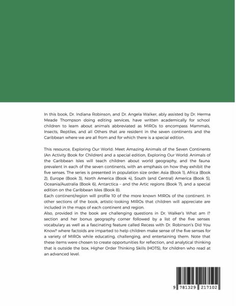 In all 8 volumes of the book, Exploring Our World: Meet Amazing Animals of the Seven Continents and the Caribbean Isles, where a child "MIRO" star enlightens us, through inquisitive questioning, on life in their world. Not only do they require knowledge of their ancestors/species lineage, name meaning, geographical orientation/habitats, physical characteristics, behavioral patterns, and their senses, they proudly claim their icon-ship as cultural symbols of the animal kingdom and as famous engineers, track stars, and superheroes. They promote world peace and diplomacy in their duties as "cultural ambassadors", following in the footsteps of Jamaica's musical group, Third World in their song titled "Reggae Ambassador". On a more serious note, coming out of the mouth of babes, child MIROs, with a big heart but little voice of their own, belt out a loud cry for help in a chorus of condemnation. To all who read the pages of these books, these child stars are imploring us, through their profiles, the question narratives, and the appendices, to take a stand on the plight of their kind. Animal/MIRO cruelty as noted in the perils and threats section, comes in the form of inhumane treatment from physical abuse and torture, exploitation as circus animals, movie actors, and forced fighting/bullfighters, human predation, pollution, loss of habitat, displacement, inflicting pains and suffering, and neglect as well as emotional abuse from caging that prevents social interaction with family and friends, deprivation and starvation from feeding them wrong foods, and hoarding, cross-breeding, overhunting, overtraining, and over-testing them. These child stars are staking a claim to their future in their birth countries, regions, and habitats that their ancestors lived in for millions of years and now they are being "evicted" from their own ancestral lands and pushed on the streets for vehicular traffic to run them over or for them to rummage in garbage bins for food, only to be shot dead for intruding on private property in sprawling luxurious housing complexes. They are urging humankind to fight on their behalf through legal advocacy, demonstrations, and peaceful protests for humane slaughtering techniques, ethical testing, and delivering compassionate speeches on the MIROs' behalf in a race against time.