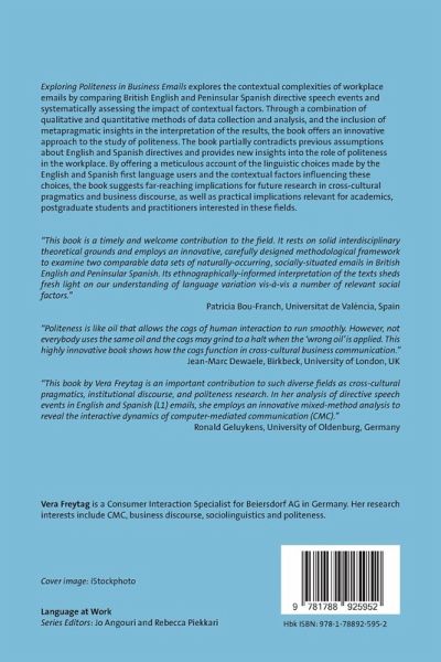 Exploring Politeness in Business Emails explores the contextual complexities of workplace emails by comparing British English and Peninsular Spanish directive speech events and systematically assessing the impact of contextual factors. Through a combination of qualitative and quantitative methods of data collection and analysis, and the inclusion of metapragmatic insights in the interpretation of the results, the book offers an innovative approach to the study of politeness. The book partially contradicts previous assumptions about English and Spanish directives and provides new insights into the role of politeness in the workplace. By offering a meticulous account of the linguistic choices made by the English and Spanish first language users and the contextual factors influencing these choices, the book suggests far-reaching implications for future research in cross-cultural pragmatics and business discourse, as well as practical implications relevant for academics, postgraduate students and practitioners interested in these fields.
