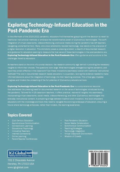 In the aftermath of the 2020-2022 pandemic, educators find themselves grappling with the decision to revert to traditional instructional methods or embrace the transformative power of 21st-century technologies. The swift integration of virtual classrooms, videoconferencing, and social media during the pandemic has left teachers navigating uncharted territory. Many, who once vehemently resisted technology, now stand on the precipice of a digital revolution in education. This dichotomy poses a pressing problem: a dearth of documented research and guidance for educators seeking to measure the true value of these technologies in the post-pandemic era. Exploring Technology-Infused Education in the Post-Pandemic Era , offers guidance and solutions to the challenges faced by educators. As teachers stand on the brink of a pivotal decision, the research community lags behind in providing the necessary insights to inform their choices. The questions loom large: What technologies emerged during the pandemic, and have they proven effective in the classroom? Can these innovations seamlessly coexist with traditional instructional methods? The void in documented research leaves educators in a quandary, lacking the evidence needed to make informed decisions about the integration of technology into their teaching practices. This critical gap impedes progress and hinders the unleashing of the full potential of 21st-century educational tools.