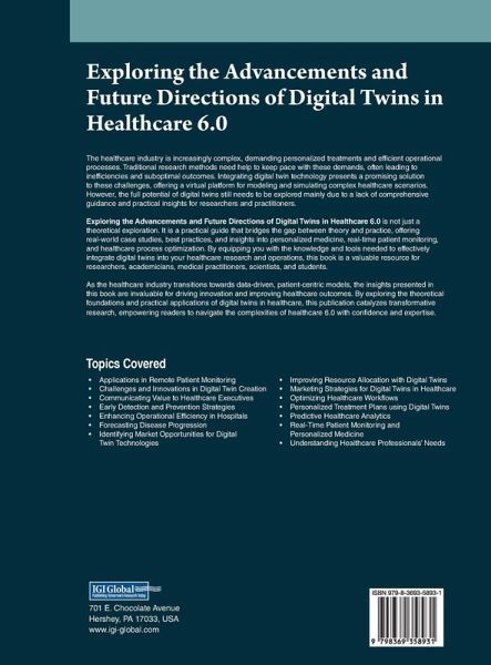 The healthcare industry is increasingly complex, demanding personalized treatments and efficient operational processes. Traditional research methods need help to keep pace with these demands, often leading to inefficiencies and suboptimal outcomes. Integrating digital twin technology presents a promising solution to these challenges, offering a virtual platform for modeling and simulating complex healthcare scenarios. However, the full potential of digital twins still needs to be explored mainly due to a lack of comprehensive guidance and practical insights for researchers and practitioners. Exploring the Advancements and Future Directions of Digital Twins in Healthcare 6.0 is not just a theoretical exploration. It is a practical guide that bridges the gap between theory and practice, offering real-world case studies, best practices, and insights into personalized medicine, real-time patient monitoring, and healthcare process optimization. By equipping you with the knowledge and tools needed to effectively integrate digital twins into your healthcare research and operations, this book is a valuable resource for researchers, academicians, medical practitioners, scientists, and students.