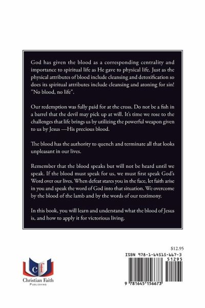 God has given the blood as a corresponding centrality and importance to spiritual life as He gave to physical life. Just as the physical attributes of blood include cleansing and detoxification so does its spiritual attributes include cleansing and atoning for sin! "No blood, no life". Our redemption was fully paid for at the cross. Do not be a fish in a barrel that the devil may pick up at will. It's time we rose to the challenges that life brings us by utilizing the powerful weapon given to us by Jesus—His precious blood. The blood has the authority to quench and terminate all that looks unpleasant in our life lives. Remember that the blood speaks but will not be heard until we speak. If the blood must speak for us, we must first speak God's Word over our lives. When defeat stares you in the face, let faith arise in you and speak the word of God into that situation. We overcome by the blood of the lamb and by the word of our testimony. In this book you will learn and understand what the blood of Jesus is, and how to apply it for victorious living.