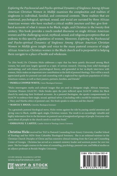 Exploring the Psychosocial and Psycho-spiritual Dynamics of Singleness Among African American Christian Women in Midlife examines the complexities and realities of singleness in individual, familial, and communal contexts. These realities that are emotional, psychological, spiritual, sexual, and social are narrated by three African American women who have reached a critical midlife juncture and they give first-hand accounts of what it means to be Black, single, and Christian in the 21st century. This book provides a much-needed discourse on single African American women and the challenging social, mythical, sexual, and religious perceptions that are endemic to this specific population of women. Moreover, Exploring the Psychosocial and Psycho-spiritual Dynamics of Singleness Among African American Christian Women in Midlife gives insight and voice to the many pastoral concerns of single African American Christian women in the Black church and is purposeful in helping them navigate to a place of health and wholeness.