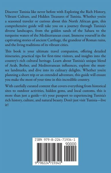Discover Tunisia like never before with Exploring the Rich History, Vibrant Culture, and Hidden Treasures of Tunisia. Whether you're a seasoned traveler or curious about this North African gem, this comprehensive guide will take you on a journey through Tunisia's diverse landscapes, from the golden sands of the Sahara to the turquoise waters of the Mediterranean coast. Immerse yourself in the captivating stories of ancient Carthage, the grandeur of Roman ruins, and the living traditions of its vibrant cities. This book is your ultimate travel companion, offering detailed itineraries, practical tips for first-time visitors, and insights into the country's rich cultural heritage. Learn about Tunisia's unique blend of Arab, Berber, and Mediterranean influences, explore the must-see landmarks, and dive into its culinary delights. Whether you're planning a short trip or an extended adventure, this guide will ensure you make the most of your time in this incredible country. With carefully curated content that covers everything from historical sites to outdoor activities, hidden gems, and local customs, this is more than just a guide-it's your passport to experiencing Tunisia's rich history, culture, and natural beauty. Don't just visit Tunisia-live it!