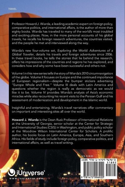 Professor Howard J. Wiarda, a leading academic expert on foreign policy, comparative politics, and international affairs, is the author of more than eighty books. Wiarda has traveled to many of the world's most troubled and exciting places. Now, in the more personal accounts of his global travels, he recalls his foreign research adventures, the countries visited, and the people he met and interviewed along the way. Wiarda's new four-volume set, Exploring the World: Adventures of a Global Traveler, details his travels and foreign adventures since 2006. In these travel books, he tells the stories that lie behind the research, offers his impressions of the countries and regions he has explored, and considers how and why some have been successful and others not. Volume I in this new series tells the story of Wiarda's 2010 circumnavigation of the globe. Volume II focuses on Europe and the continued importance of European regionalism-despite the bumper stickers advertising "Europe Whole and Free." Volume III deals with Latin America and questions whether the region is really as democratic as we would like it to be. Volume IV provides Wiarda's analysis of Asia's economic miracles while also recounting his recent visits to the Persian Gulf and his assessment of modernization and development in the Islamic world. Insightful and entertaining, Wiarda's travel narratives offer commentary on important and interesting sites all over the world.