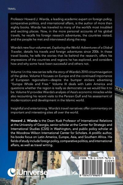 Professor Howard J. Wiarda, a leading academic expert on foreign policy, comparative politics, and international affairs, is the author of more than eighty books. Wiarda has traveled to many of the world's most troubled and exciting places. Now, in the more personal accounts of his global travels, he recalls his foreign research adventures, the countries visited, and the people he met and interviewed along the way. Wiarda's new four-volume set, Exploring the World: Adventures of a Global Traveler, details his travels and foreign adventures since 2006. In these travel books, he tells the stories that lie behind the research, offers his impressions of the countries and regions he has explored, and considers how and why some have been successful and others not. Volume I in this new series tells the story of Wiarda's 2010 circumnavigation of the globe. Volume II focuses on Europe and the continued importance of European regionalism-despite the bumper stickers advertising "Europe Whole and Free." Volume III deals with Latin America and questions whether the region is really as democratic as we would like it to be. Volume IV provides Wiarda's analysis of Asia's economic miracles while also recounting his recent visits to the Persian Gulf and his assessment of modernization and development in the Islamic world. Insightful and entertaining, Wiarda's travel narratives offer commentary on important and interesting sites all over the world.