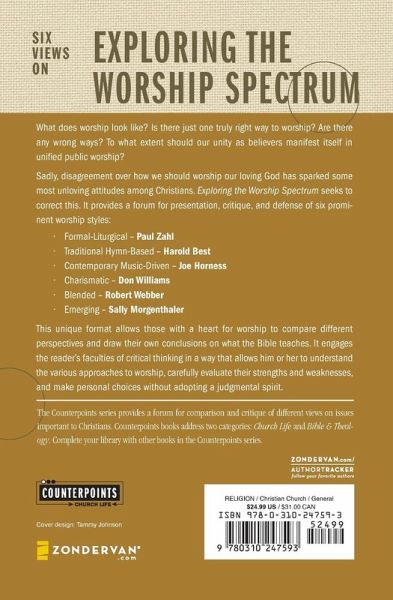 An exploration of what worship looks like from a biblical standpoint and why the topic of worship can be so contentious among Christians. Because worship is inherently theological--because it's a manifestation of humanity's response to God's holiness--it's important to take seriously how we worship and the roles it serves in personal displays of adoration and in community with other believers. Exploring the Worship Spectrum provides an overview, critique, and celebration of six prominent worship styles: Formal-Liturgical - represented by Paul Zahl Traditional Hymn-Based - represented by Harold Best Contemporary Music-Driven - represented by Joe Horness Charismatic - represented by Don Williams Blended - represented by Robert Webber Emerging - represented by Sally Morgenthaler This unique format allows those with a heart for worship to compare different perspectives and draw their own conclusions on what the Bible teaches. It allows readers to understand the various approaches to worship, carefully evaluate their strengths and weaknesses, and make personal choices without adopting a judgmental spirit. The Counterpoints series presents a comparison and critique of scholarly views on topics important to Christians that are both fair-minded and respectful of the biblical text. Each volume is a one-stop reference that allows readers to evaluate the different positions on a specific issue and form their own, educated opinion.