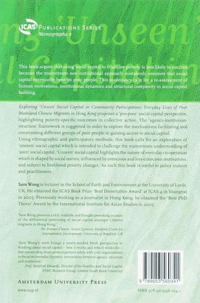This book argues that using social capital to eradicate poverty is less likely to succeed because the mainstream neoinstitutional approach mistakenly assumes that social capital necessarily benefits poor people. This inadequacy calls for a re-assessment of human motivations, institutional dynamics and structural complexity in social capital building. Using ethnographic and participatory methods, this book calls for an exploration of 'unseen' social capital which is intended to challenge the mainstream understanding of 'seen' social capital. As such this book is useful to policy makers and practitioners.