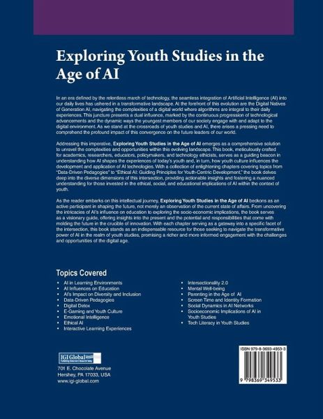 In an era defined by the relentless march of technology, the seamless integration of Artificial Intelligence (AI) into our daily lives has ushered in a transformative landscape. At the forefront of this evolution are the Digital Natives of Generation AI, navigating the complexities of a digital world where algorithms are integral to their daily experiences. This juncture presents a dual influence, marked by the continuous progression of technological advancements and the dynamic ways the youngest members of our society engage with and adapt to the digital environment. As we stand at the crossroads of youth studies and AI, there arises a pressing need to comprehend the profound impact of this convergence on the future leaders of our world. Addressing this imperative, Exploring Youth Studies in the Age of AI emerges as a comprehensive solution to unravel the complexities and opportunities within this evolving landscape. This book, meticulously crafted for academics, researchers, educators, policymakers, and technology ethicists, serves as a guiding beacon in understanding how AI shapes the experiences of today's youth and, in turn, how youth culture influences the development and application of AI technologies. With a collection of enlightening chapters covering topics from "Data-Driven Pedagogies" to "Ethical AI: Guiding Principles for Youth-Centric Development," the book delves deep into the diverse dimensions of this intersection, providing actionable insights and fostering a nuanced understanding for those invested in the ethical, social, and educational implications of AI within the context of youth.