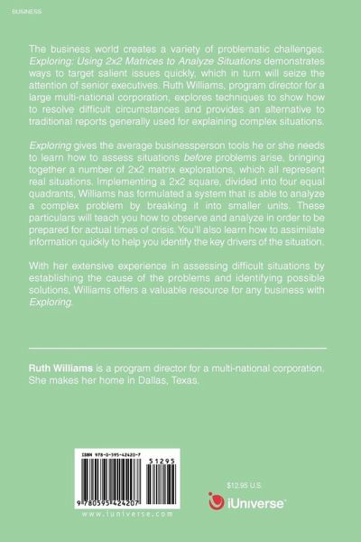 The business world creates a variety of problematic challenges. Exploring: Using 2 x 2 Matrices to Analyze Situations demonstrates ways to target salient issues quickly, which in turn will seize the attention of senior executives. Ruth Williams, program director for a large multi-national corporation, explores techniques to show how to resolve difficult circumstances and provides an alternative to traditional reports generally used for explaining complex situations. Exploring gives the average businessperson tools they need to learn how to assess situations before problems arise, bringing together a number of 2 x 2 matrix explorations, which all represent real situations. Implementing a 2 x 2 square, divided into four equal quadrants, Williams has formulated a system that is able to analyze a complex problem by breaking it into smaller units. These particulars will teach you how to observe and analyze in order to be prepared for actual times of crisis. You'll also learn how to assimilate information quickly to help you identify the key drivers of the situation. With her extensive experience in assessing difficult situations by establishing the cause of the problems and identifying possible solutions, Williams offers a valuable resource for any business with Exploring.