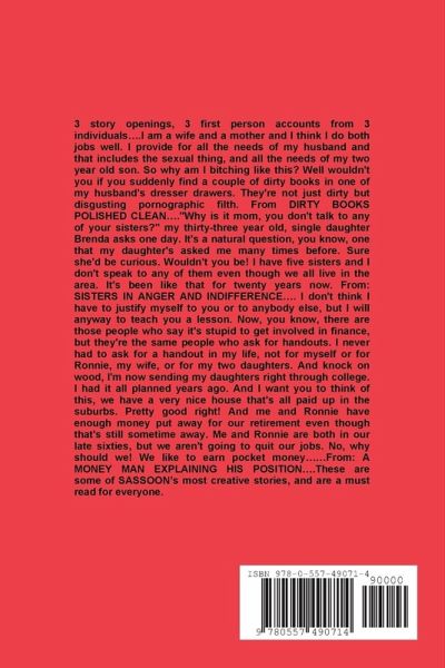 3 story openings, 3 first person story accounts. ... I am a wife and a mother. Think I do both well. I provide for all the needs of my husband and that includes the sexual thing. Why am I bitching? Wouldn't you if you suddenly find dirty books in my husband's dresser drawer. They're not just dirty but disgusting. From DIRTY BOOKS POLISHED CLEAN..."Why is it mom, you don't talk to your sisters?" my single daughter asks. A natural question, one she's asked before. Sure she'd be curious. I have five sisters and don't speak to any of them. From: SISTERS IN ANGER AND INDIFFERENCE.... Don't think I have to justify myself to you, but I will to teach you a lesson. There are those who say it's stupid to get involved in finance; they're the same ones who ask for handouts. Never had to ask for a handout in my life, not for myself or for Ronnie, my wife. Knock on wood, I'm now sending the my girls through college. Had it planned years ago. Pretty good right! ...From: A MONEY MAN EXPLAINING HIS POSITION