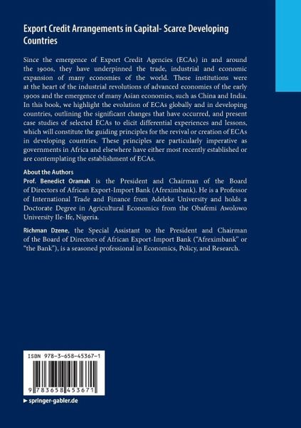 Since the emergence of Export Credit Agencies (ECAs) in and around the 1900s, they have underpinned the trade, industrial and economic expansion of many economies of the world. These institutions were at the heart of the industrial revolutions of advanced economies of the early 1900s and the emergence of many Asian economies, such as China and India. In this book, we highlight the evolution of ECAs globally and in developing countries, outlining the significant changes that have occurred, and present case studies of selected ECAs to elicit differential experiences and lessons, which will constitute the guiding principles for the revival or creation of ECAs in developing countries. These principles are particularly imperative as governments in Africa and elsewhere have either most recently established or are contemplating the establishment of ECAs.