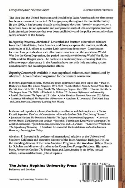 The idea that the United States can and should help Latin America achieve democracy has been a recurrent theme in U.S. foreign policy throughout the twentieth century. By the 1990s, it had become virtually unchallenged doctrine, broadly supported on a bipartisan basis. Yet no systematic and comparative study of U.S. attempts to promote Latin American democracy has ever been published -- and the policy community often seems unaware of this history. In Exporting Democracy, Abraham F. Lowenthal and fourteen other noted scholars from the United States, Latin America, and Europe explore the motives, methods, and results of U.S. efforts to nurture Latin American democracy. Contributors focus on four periods when such efforts were most intense: the years from World War I to the Great Depression, the period immediately following World War II, the 1960s, and the Reagan years. The book tells a cautionary tale -- revealing that U.S. efforts to export democracy in the Americas have met with little enduring success and often have had counterproductive effects. Exporting Democracy is available in two paperback volumes, each introduced by Abraham Lowenthal and organized for convenient course use. In the first paperback volume, Themes and Issues, contributors and their topics are Paul W. Drake, From Good Men to Good Neighbors: 1912-1932; Leslie Bethell, From the Second World War to the Cold War: 1944-1954; Tony Smith, the Alliance for Progress: The 1960s; Thomas Carothers:, The Reagan Years: The 1980s; Elizabeth A. Cobbs, U.S. Business: Self-Interest and Neutrality; Paul G. Buchanan, The Impact of U.S. Labor; John Sheahan, Economic Forces and U.S. Policies; Laurence Whitehead, The Imposition of Democracy; Abraham F. Lowenthal, The United States and Latin American Democracy: Learning from History. In the second paperback volume, Case Studies, the contributors and their topics are: Carlos Escude, Argentina: The Costs of Contradiction; Heraldo Munoz, Chile: The Limits of "Success"; Jonathan Hartlyn, The Dominican Republic: The Legacy of Intermittent Engagement; Lorenzo Meyer, Mexico: The Exception and the Rule; Joseph Tulchin and Knut Walter, Nicaragua: The Limits of Intervention; Elizabeth A. Cobbs, U.S. Business: Self-Interest and Neutrality; Paul G. Buchanan, The Impact of U.S. Labor; John Sheahan, Economic Forces and U.S. Policies; Laurence Whitehead, The Imposition of Democracy; Abraham F. Lowenthal, The United States and Latin American Democracy: Learning from History.