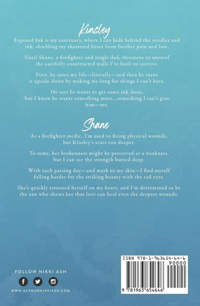 Kinsley Exposed Ink is my sanctuary, where I can hide behind the needles and ink, shielding my shattered heart from further pain and loss. Until Shane, a firefighter and single dad, threatens to unravel the carefully constructed walls I've built to survive. First, he saves my life-literally-and then he turns it upside down by making me long for things I can't have. He says he wants to get some ink done, but I know he wants something more ... something I can't give him-me. Shane As a firefighter medic, I'm used to fixing physical wounds, but Kinsley's scars run deeper. To some, her brokenness might be perceived as a weakness, but I can see the strength buried deep. With each passing day-and mark to my skin-I find myself falling harder for the striking beauty with the sad eyes. She's quickly tattooed herself on my heart, and I'm determined to be the one who shows her that love can heal even the deepest wounds.
