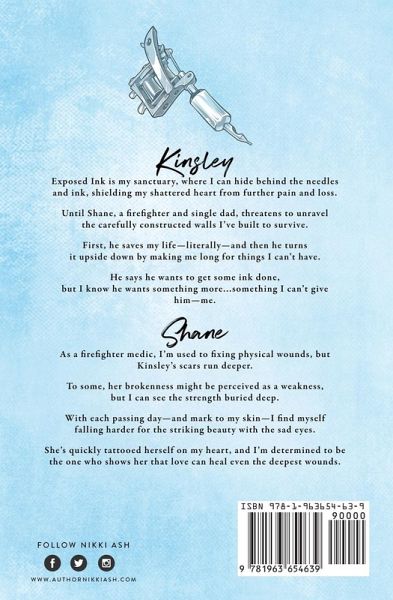 Kinsley Exposed Ink is my sanctuary, where I can hide behind the needles and ink, shielding my shattered heart from further pain and loss. Until Shane, a firefighter and single dad, threatens to unravel the carefully constructed walls I've built to survive. First, he saves my life-literally-and then he turns it upside down by making me long for things I can't have. He says he wants to get some ink done, but I know he wants something more ... something I can't give him-me. Shane As a firefighter medic, I'm used to fixing physical wounds, but Kinsley's scars run deeper. To some, her brokenness might be perceived as a weakness, but I can see the strength buried deep. With each passing day-and mark to my skin-I find myself falling harder for the striking beauty with the sad eyes. She's quickly tattooed herself on my heart, and I'm determined to be the one who shows her that love can heal even the deepest wounds.
