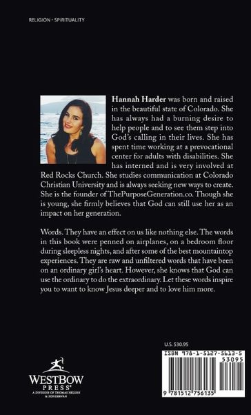 Words. They have an effect on us like nothing else. The words in this book were penned on airplanes, on a bedroom floor during sleepless nights, and after some of the best mountaintop experiences. They are raw and unfiltered words that have been on an ordinary girl's heart. However, she knows that God can use the ordinary to do the extraordinary. Let these words inspire you to want to know Jesus deeper and to love him more.