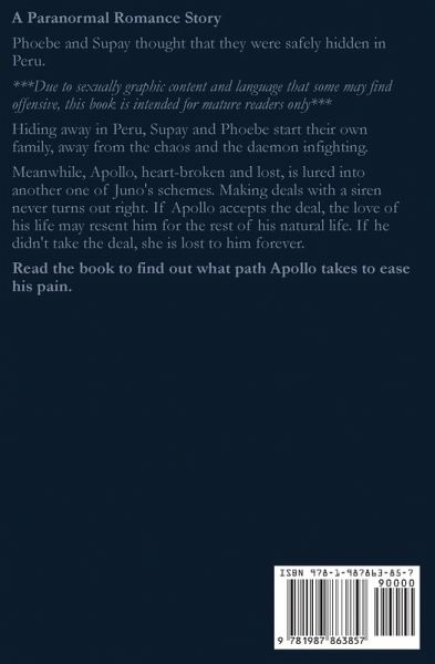 A Paranormal Romance Story Phoebe and Supay thought that they were safely hidden in Peru. ***Due to sexually graphic content and language that some may find offensive, this book is intended for mature readers only*** Hiding away in Peru, Supay and Phoebe start their own family, away from the chaos and the daemon infighting. Meanwhile, Apollo, heart-broken and lost, is lured into another one of Juno's schemes. Making deals with a siren never turns out right. If Apollo accepts the deal, the love of his life may resent him for the rest of his natural life. If he didn't take the deal, she is lost to him forever. Read the book to find out what path Apollo takes to ease his pain.